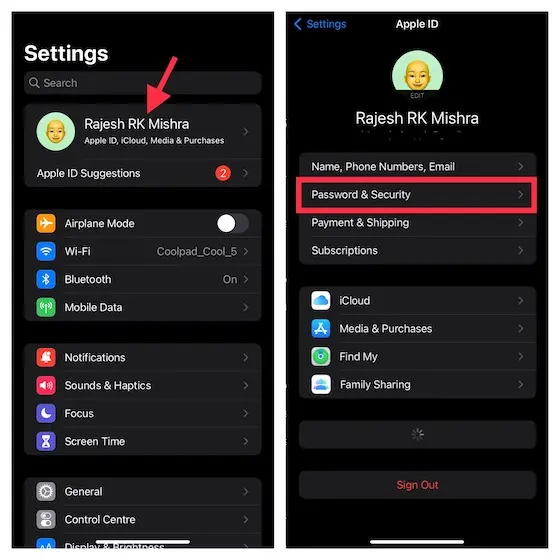 1. در آیفون خود، به Settings بروید، روی بنر اپل آیدی در بالای صفحه ضربه بزنید و سپس گزینه Password & Security را انتخاب کنید.