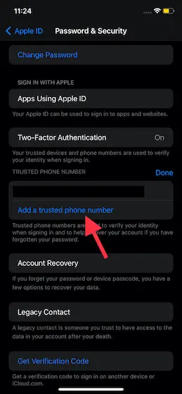 4. سپس گزینه افزودن شماره تلفن جدید (Add a trusted phone number) را انتخاب کنید.