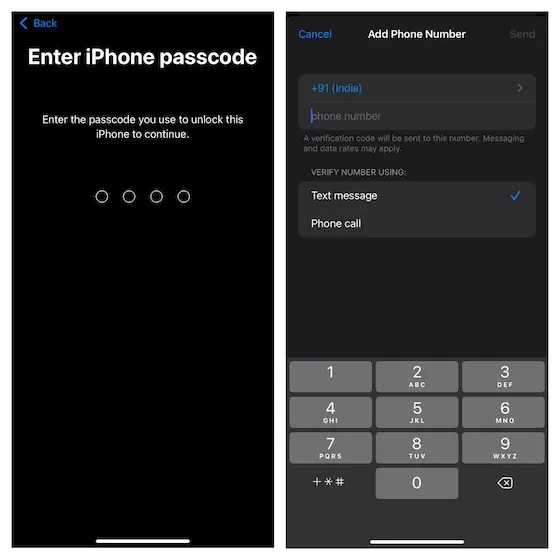 5. پس از آن، باید رمز عبور دستگاه خود را وارد کنید تا بتوانید ادامه دهید. سپس، کد کشور را انتخاب کرده و شماره تلفن یا شماره گوگل ویس جدیدی را وارد کنید.